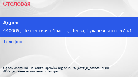 Столовая по адресу 440009, Пензенская область, Пенза, Тухачевского, 67 к1 в дальнейшем Организация, размещена в следующих категориях: