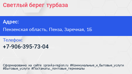 Светлый берег, турбаза по адресу Пензенская область, Пенза, Заречная, 1Б в дальнейшем Организация, размещена в следующих категориях: