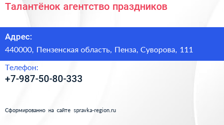 Талантёнок, агентство праздников по адресу 440000, Пензенская область, Пенза, Суворова, 111 в дальнейшем Организация, размещена в следующих категориях: