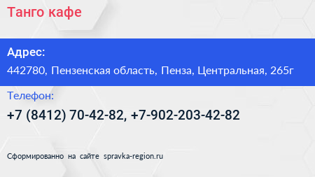Танго, кафе по адресу 442780, Пензенская область, Пенза, Центральная, 265г в дальнейшем Организация, размещена в следующих категориях: