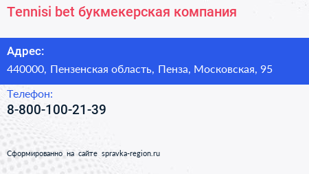 Tennisi.bet, букмекерская компания по адресу 440000, Пензенская область, Пенза, Московская, 95 в дальнейшем Организация, размещена в следующих категориях: