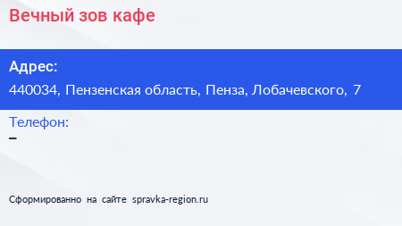 Вечный зов, кафе по адресу 440034, Пензенская область, Пенза, Лобачевского, 7 в дальнейшем Организация, размещена в следующих категориях: