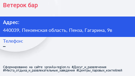 Ветерок, бар по адресу 440039, Пензенская область, Пенза, Гагарина, 9в в дальнейшем Организация, размещена в следующих категориях: