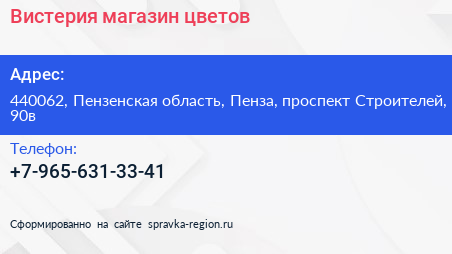 Вистерия, магазин цветов по адресу 440062, Пензенская область, Пенза, проспект Строителей, 90в в дальнейшем Организация, размещена в следующих категориях:
