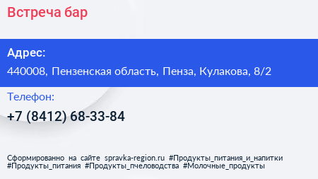 Встреча, бар по адресу 440008, Пензенская область, Пенза, Кулакова, 8/2 в дальнейшем Организация, размещена в следующих категориях: