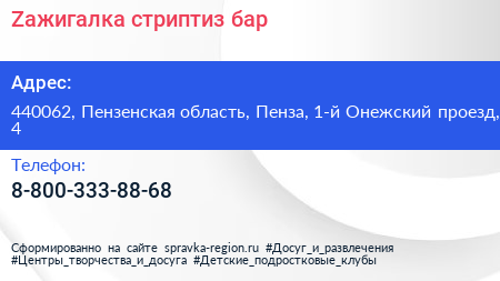 Zажигалка, стриптиз-бар по адресу 440062, Пензенская область, Пенза, 1-й Онежский проезд, 4 в дальнейшем Организация, размещена в следующих категориях: