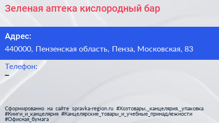Зеленая аптека, кислородный бар по адресу 440000, Пензенская область, Пенза, Московская, 83 в дальнейшем Организация, размещена в следующих категориях: