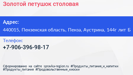 Золотой петушок, столовая по адресу 440015, Пензенская область, Пенза, Аустрина, 144г лит Б в дальнейшем Организация, размещена в следующих категориях:
