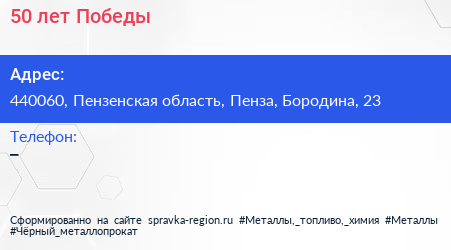 50 лет Победы по адресу 440060, Пензенская область, Пенза, Бородина, 23 в дальнейшем Организация, размещена в следующих категориях: