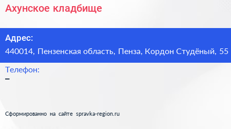 Ахунское кладбище по адресу 440014, Пензенская область, Пенза, Кордон Студёный, 55 в дальнейшем Организация, размещена в следующих категориях: