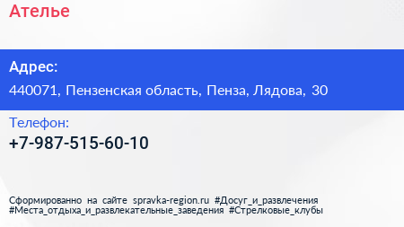 Ателье по адресу 440071, Пензенская область, Пенза, Лядова, 30 в дальнейшем Организация, размещена в следующих категориях: