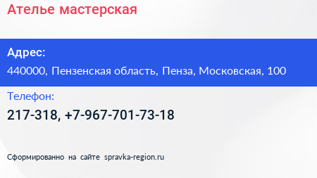 Ателье-мастерская по адресу 440000, Пензенская область, Пенза, Московская, 100 в дальнейшем Организация, размещена в следующих категориях:
