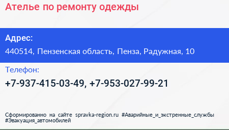 Ателье по ремонту одежды по адресу 440514, Пензенская область, Пенза, Радужная, 10 в дальнейшем Организация, размещена в следующих категориях: