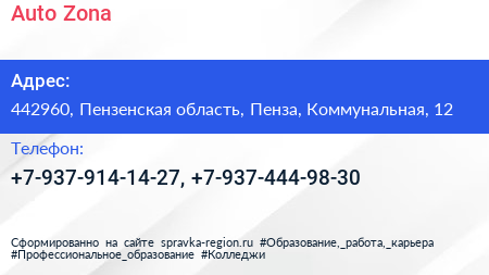 Auto Zona по адресу 442960, Пензенская область, Пенза, Коммунальная, 12 в дальнейшем Организация, размещена в следующих категориях: