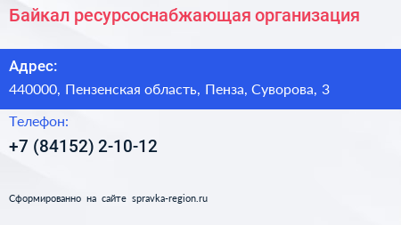 Байкал, ресурсоснабжающая организация по адресу 440000, Пензенская область, Пенза, Суворова, 3 в дальнейшем Организация, размещена в следующих категориях: