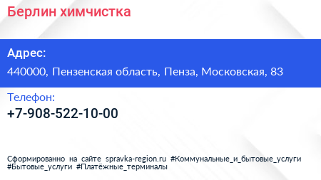 Берлин, химчистка по адресу 440000, Пензенская область, Пенза, Московская, 83 в дальнейшем Организация, размещена в следующих категориях: