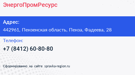 ЭнергоПромРесурс по адресу 442961, Пензенская область, Пенза, Фадеева, 28 в дальнейшем Организация, размещена в следующих категориях: