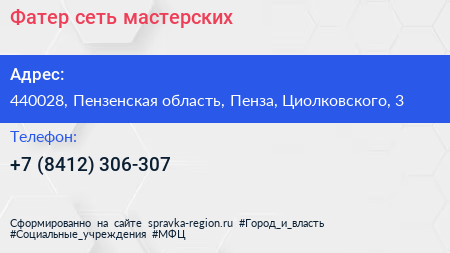 Фатер, сеть мастерских по адресу 440028, Пензенская область, Пенза, Циолковского, 3 в дальнейшем Организация, размещена в следующих категориях: