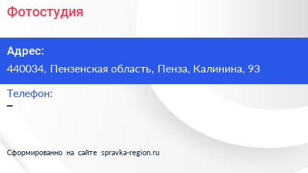 Фотостудия по адресу 440034, Пензенская область, Пенза, Калинина, 93 в дальнейшем Организация, размещена в следующих категориях: