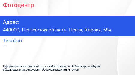 Фотоцентр по адресу 440000, Пензенская область, Пенза, Кирова, 58а в дальнейшем Организация, размещена в следующих категориях: