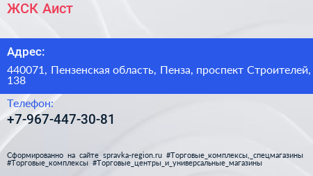 ЖСК Аист по адресу 440071, Пензенская область, Пенза, проспект Строителей, 138 в дальнейшем Организация, размещена в следующих категориях: