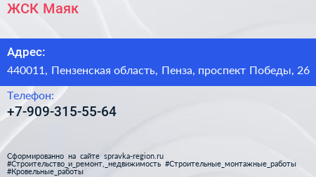 ЖСК Маяк по адресу 440011, Пензенская область, Пенза, проспект Победы, 26 в дальнейшем Организация, размещена в следующих категориях: