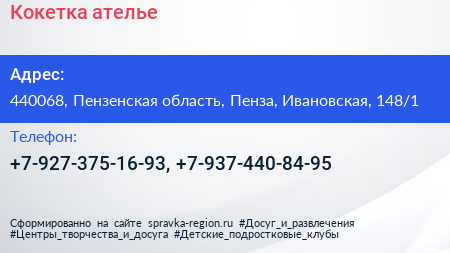 Кокетка, ателье по адресу 440068, Пензенская область, Пенза, Ивановская, 148/1 в дальнейшем Организация, размещена в следующих категориях:
