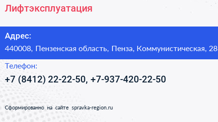 Лифтэксплуатация по адресу 440008, Пензенская область, Пенза, Коммунистическая, 28 в дальнейшем Организация, размещена в следующих категориях:
