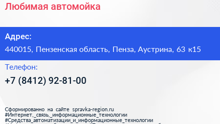 Любимая, автомойка по адресу 440015, Пензенская область, Пенза, Аустрина, 63 к15 в дальнейшем Организация, размещена в следующих категориях: