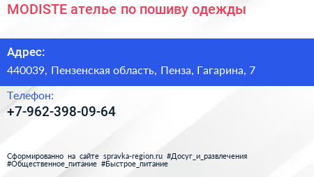 MODISTE, ателье по пошиву одежды по адресу 440039, Пензенская область, Пенза, Гагарина, 7 в дальнейшем Организация, размещена в следующих категориях: