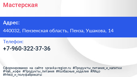Мастерская по адресу 440032, Пензенская область, Пенза, Ушакова, 14 в дальнейшем Организация, размещена в следующих категориях: