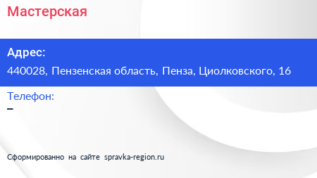 Мастерская по адресу 440028, Пензенская область, Пенза, Циолковского, 16 в дальнейшем Организация, размещена в следующих категориях: