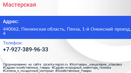 Мастерская по адресу 440062, Пензенская область, Пенза, 1-й Онежский проезд, 4 в дальнейшем Организация, размещена в следующих категориях: