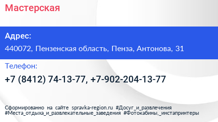 Мастерская по адресу 440072, Пензенская область, Пенза, Антонова, 31 в дальнейшем Организация, размещена в следующих категориях: