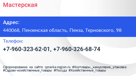 Мастерская по адресу 440068, Пензенская область, Пенза, Терновского, 98 в дальнейшем Организация, размещена в следующих категориях: