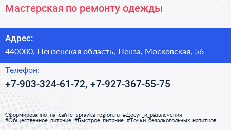 Мастерская по ремонту одежды по адресу 440000, Пензенская область, Пенза, Московская, 56 в дальнейшем Организация, размещена в следующих категориях: