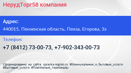 НерудТорг58, компания по адресу 440015, Пензенская область, Пенза, Егорова, 3э в дальнейшем Организация, размещена в следующих категориях: