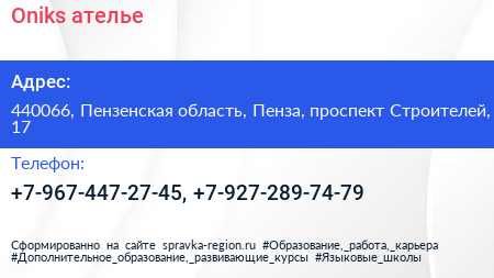 Oniks, ателье по адресу 440066, Пензенская область, Пенза, проспект Строителей, 17 в дальнейшем Организация, размещена в следующих категориях: