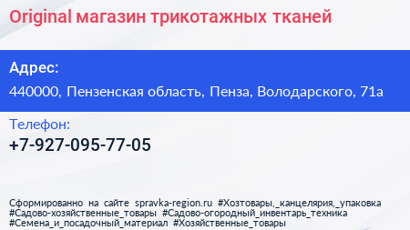 Original, магазин трикотажных тканей по адресу 440000, Пензенская область, Пенза, Володарского, 71а в дальнейшем Организация, размещена в следующих категориях: