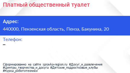 Платный общественный туалет по адресу 440000, Пензенская область, Пенза, Бакунина, 20 в дальнейшем Организация, размещена в следующих категориях: