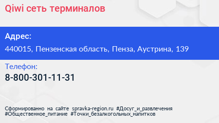 Qiwi, сеть терминалов по адресу 440015, Пензенская область, Пенза, Аустрина, 139 в дальнейшем Организация, размещена в следующих категориях: