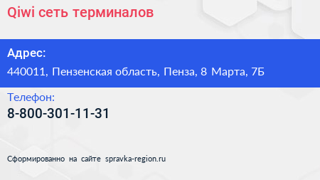 Qiwi, сеть терминалов по адресу 440011, Пензенская область, Пенза, 8 Марта, 7Б в дальнейшем Организация, размещена в следующих категориях: