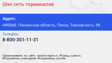 Qiwi, сеть терминалов по адресу 440068, Пензенская область, Пенза, Терновского, 98 в дальнейшем Организация, размещена в следующих категориях: