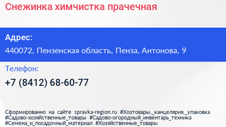 Снежинка, химчистка-прачечная по адресу 440072, Пензенская область, Пенза, Антонова, 9 в дальнейшем Организация, размещена в следующих категориях: