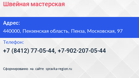Швейная мастерская по адресу 440000, Пензенская область, Пенза, Московская, 97 в дальнейшем Организация, размещена в следующих категориях: