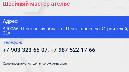 Швейный мастер, ателье по адресу 440066, Пензенская область, Пенза, проспект Строителей, 21а в дальнейшем Организация, размещена в следующих категориях: