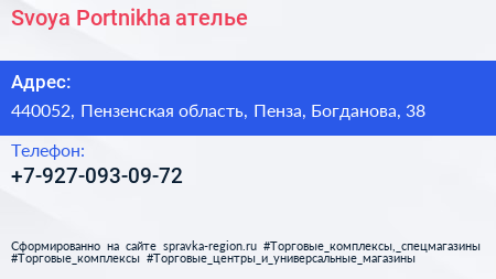 Svoya Portnikha, ателье по адресу 440052, Пензенская область, Пенза, Богданова, 38 в дальнейшем Организация, размещена в следующих категориях: