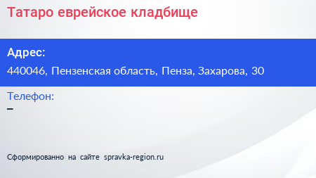 Татаро-еврейское кладбище по адресу 440046, Пензенская область, Пенза, Захарова, 30 в дальнейшем Организация, размещена в следующих категориях: