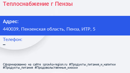 Теплоснабжение г. Пензы по адресу 440039, Пензенская область, Пенза, ИТР, 5 в дальнейшем Организация, размещена в следующих категориях: