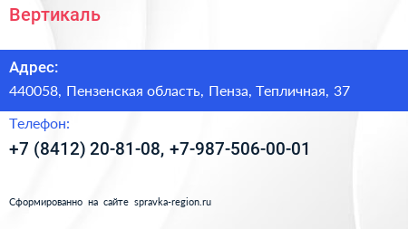 Вертикаль по адресу 440058, Пензенская область, Пенза, Тепличная, 37 в дальнейшем Организация, размещена в следующих категориях: